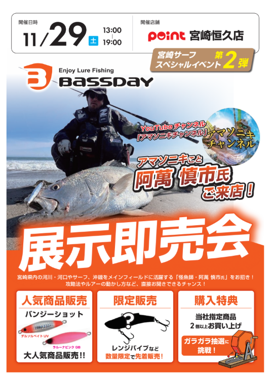 宮崎県内の河川・河口やサーフ、沖磯をメインフィールドに活躍する「怪魚師阿萬 慎市氏」をお招き!