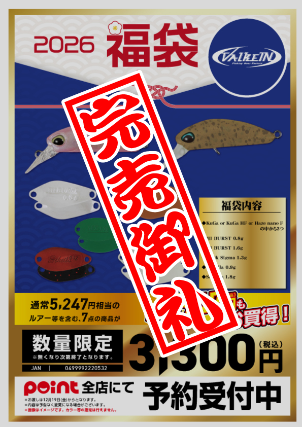投稿日: 11月 19, 20251月 5, 2026 投稿者: 釣りのポイント【2026福袋】ヴァルケイン ※写真はイメージです。無くなり次第終了とさせていただきます。 ※すでに予約の受付が終了している場合もございますので、 在庫の確認は店舗スタッフへお尋ねください。 ≪2026メーカー福袋 一覧ページに戻る≫