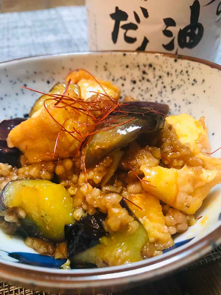 ②フライパンにごま油を引き、ミンチ肉を炒め8割火が通ったら一旦、取り出しておく。そのフライパンで茄子を炒め(油が少なく感じたらごま油を追加)、茄子が透き通ってきたら厚揚げを入れ ミンチ肉もフライパンに戻し炒め合わせる