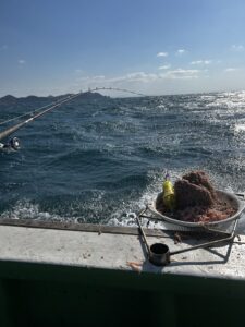 - シャクリながら巻き上げてコマセ(アミエビ)を撒く