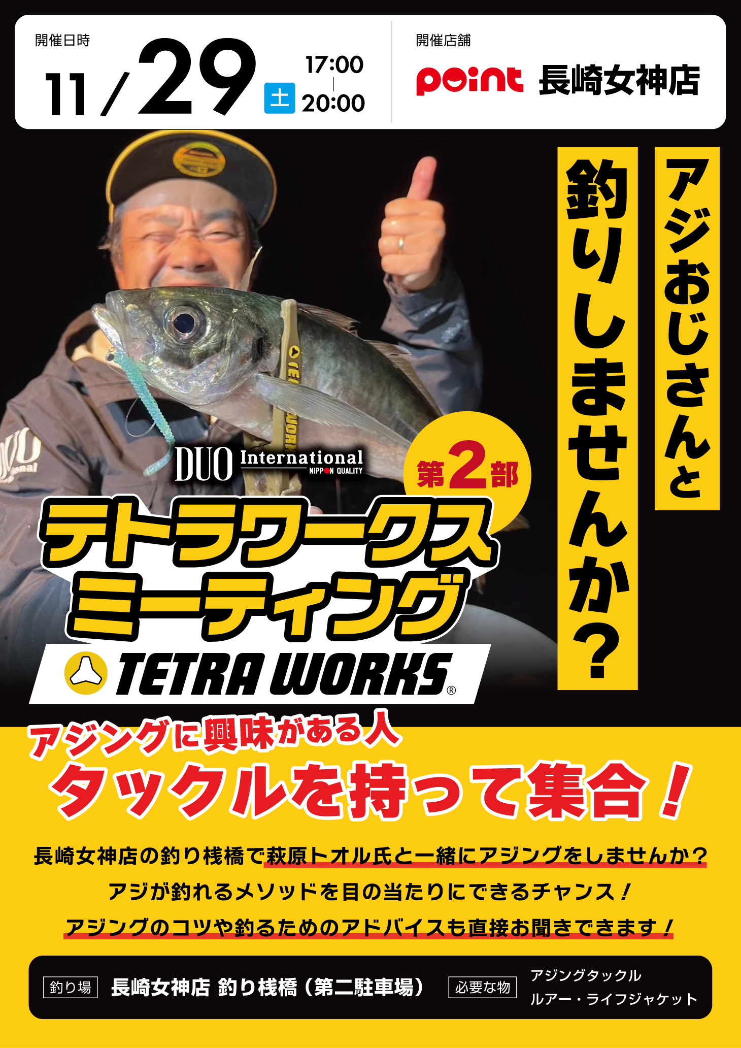 第二部は長崎女神店の釣り桟橋(第二駐車場)で萩原トオル氏と一緒にアジングができる!(第二部の詳細はコチラをタップ)