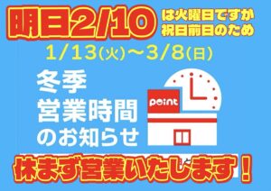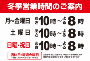 土曜日・日曜・祝日の営業開始時間が朝10時からと1時間遅くなります!