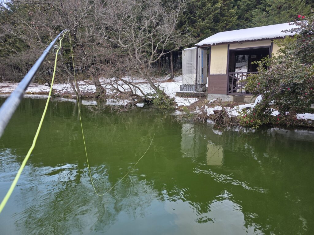 桟橋に歩いていく際、ストラクチャー沿いに回遊していく鱒を見かけたのでこれは…?と思い
