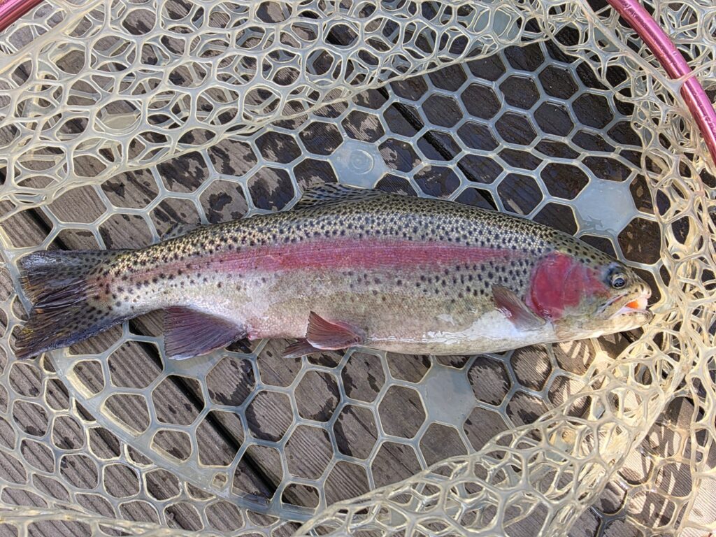前日の夕方に放流が入っていたので、朝方から物凄い勢いでいろんな人のロッドが曲がっていました