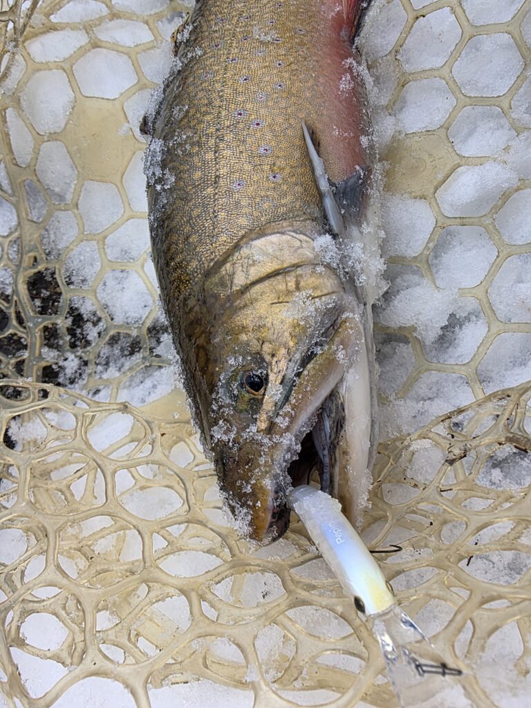 その後雪が止んで若干水の色が濁りだしたのでフライをオレンジ系統に変更