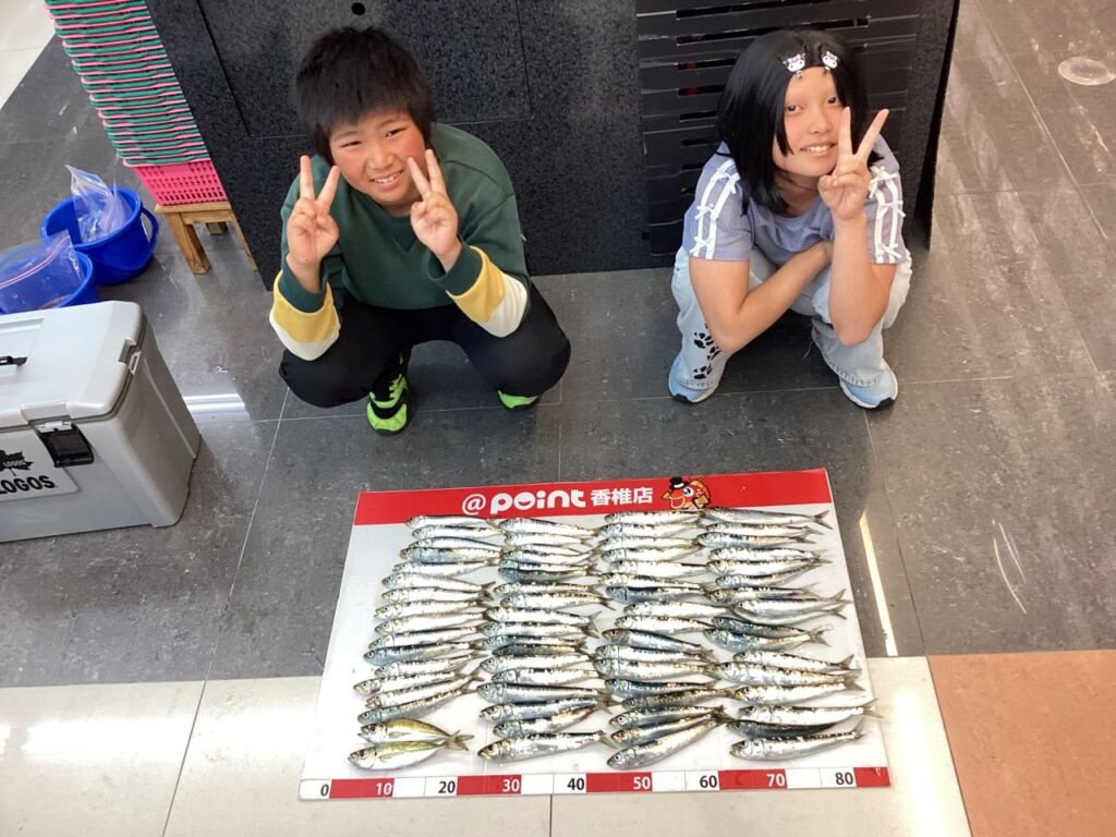 | 玲菜ちゃん、凌雅くん、貴重なお持ち込みありがとうございます😊香椎店近郊の釣り場『新宮漁港』にて見事!25cmのイワシと20cmのアジをGET!おめでとうございます😆夜ご飯が楽しみですね😄次回のお持ち込みも楽しみにお待ち致しております😊 |
