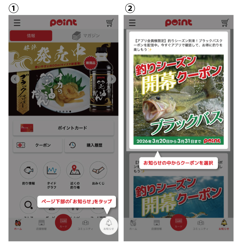 ②お知らせの中からクーポンを選択