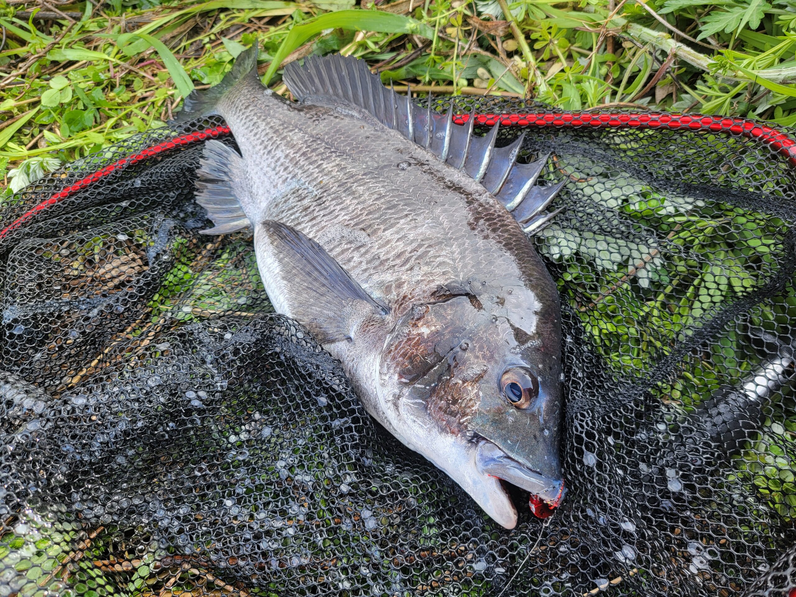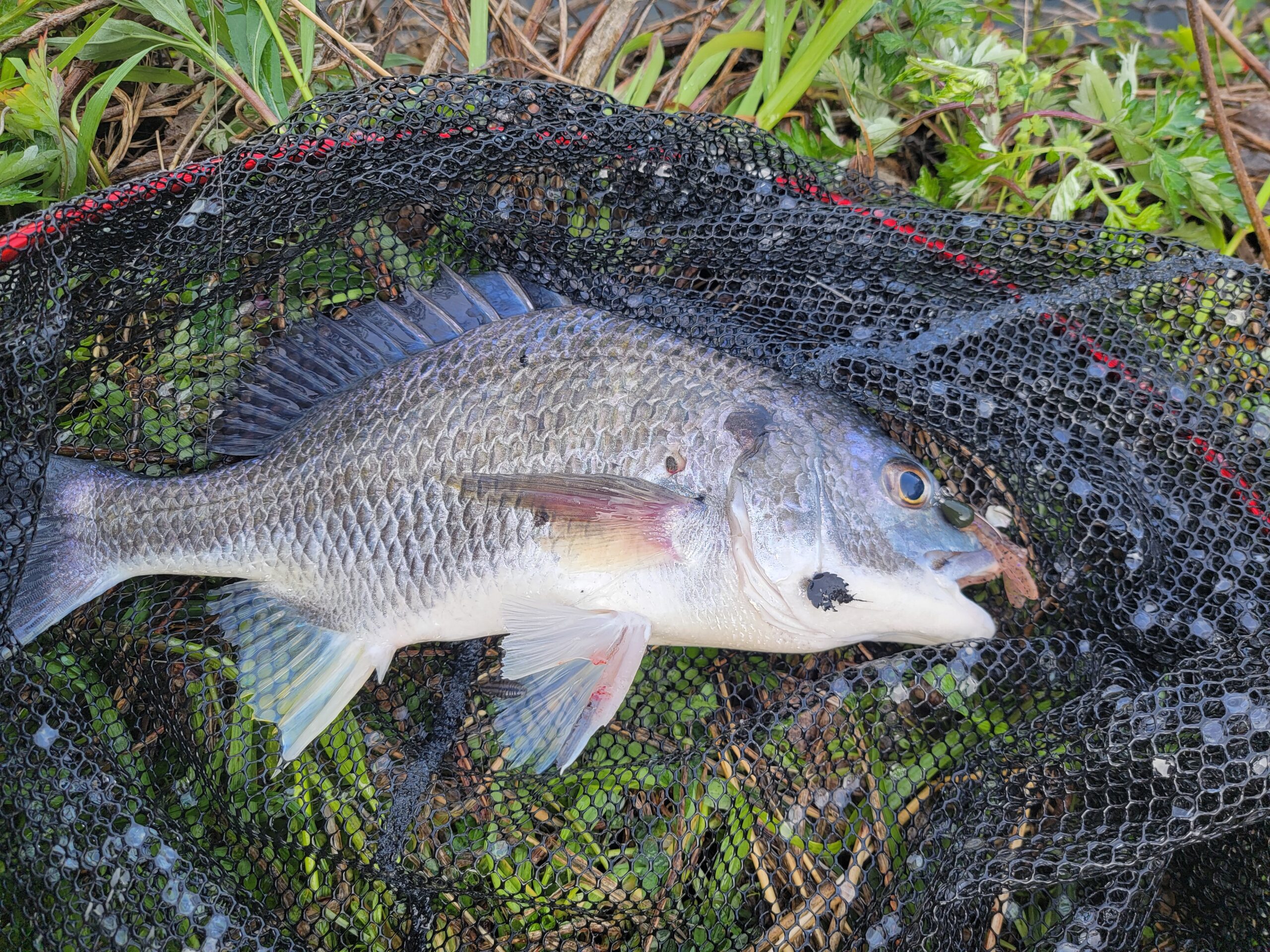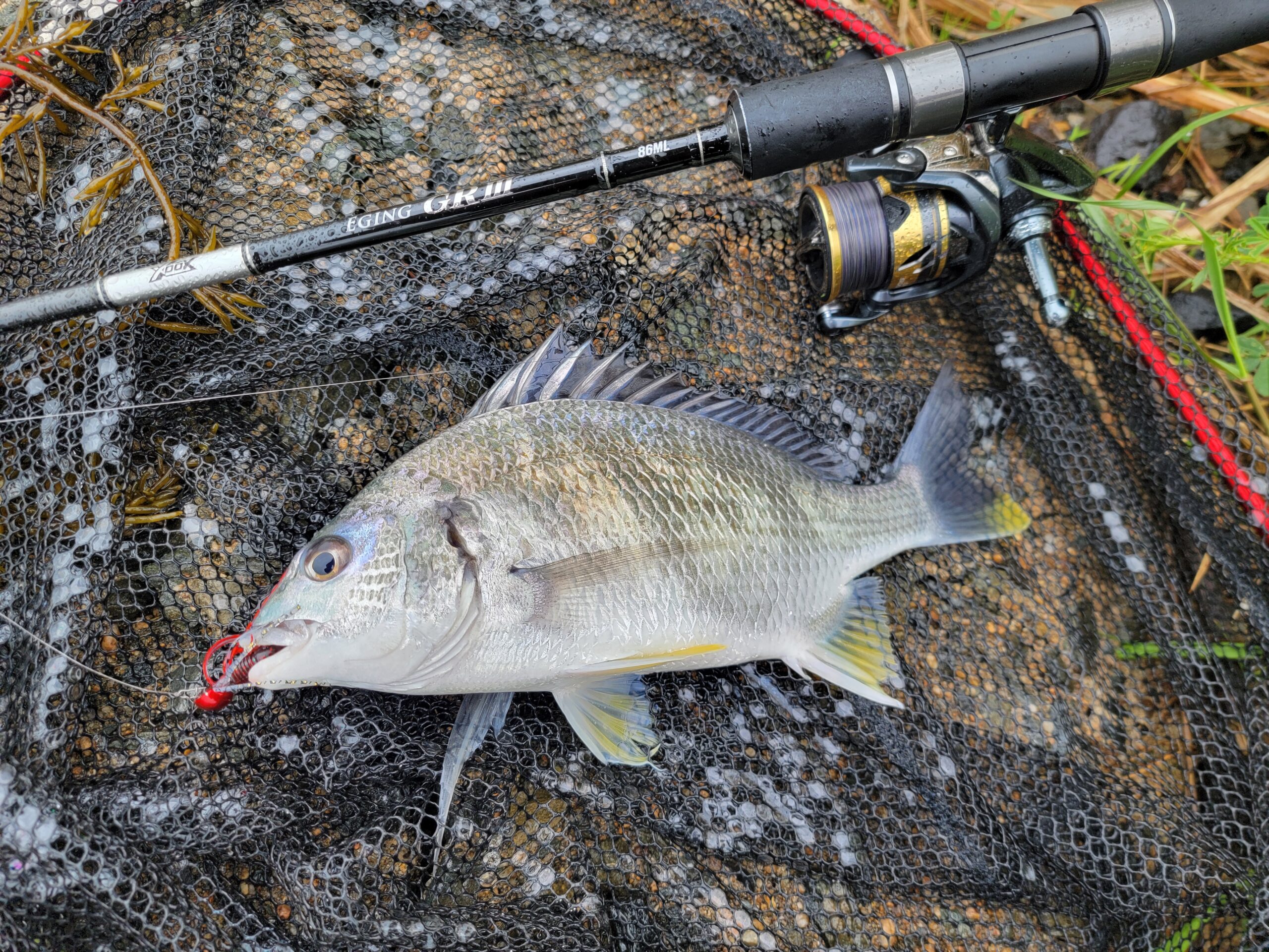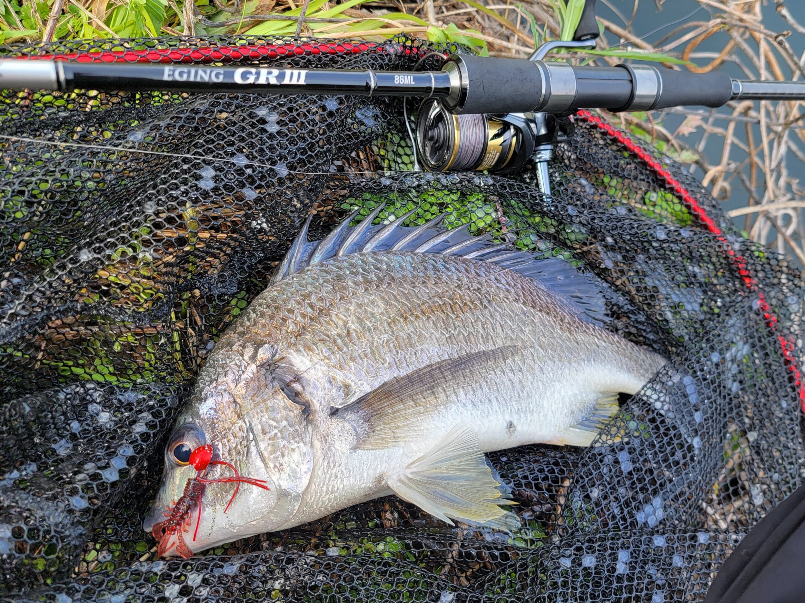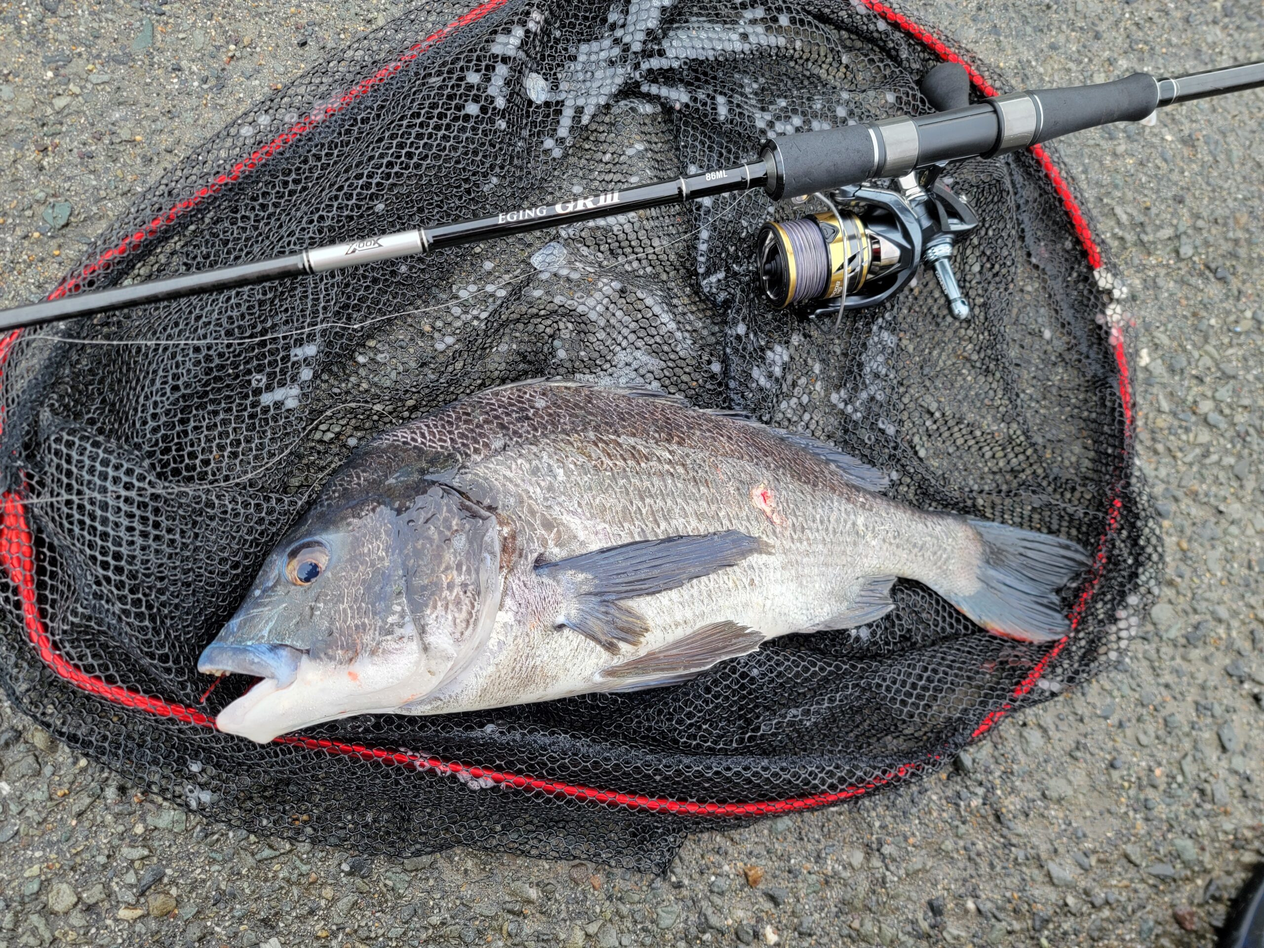 このキビレラッシュの合間に足元にチヌがやってきたので、ゆっくりめのズル引きとシェイク(竿先でちょんちょん)を組み合わせて誘うと飛びかかってきてヒット!!