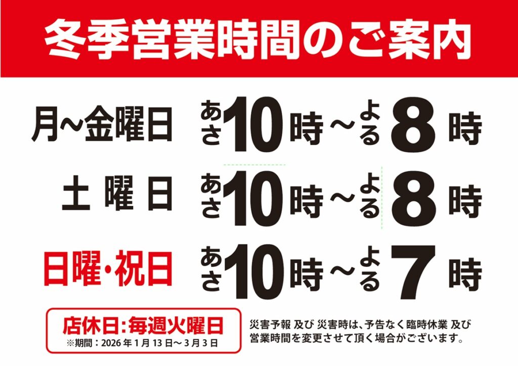 2026年1月13日(火)~3月8日(日)までの営業時間は