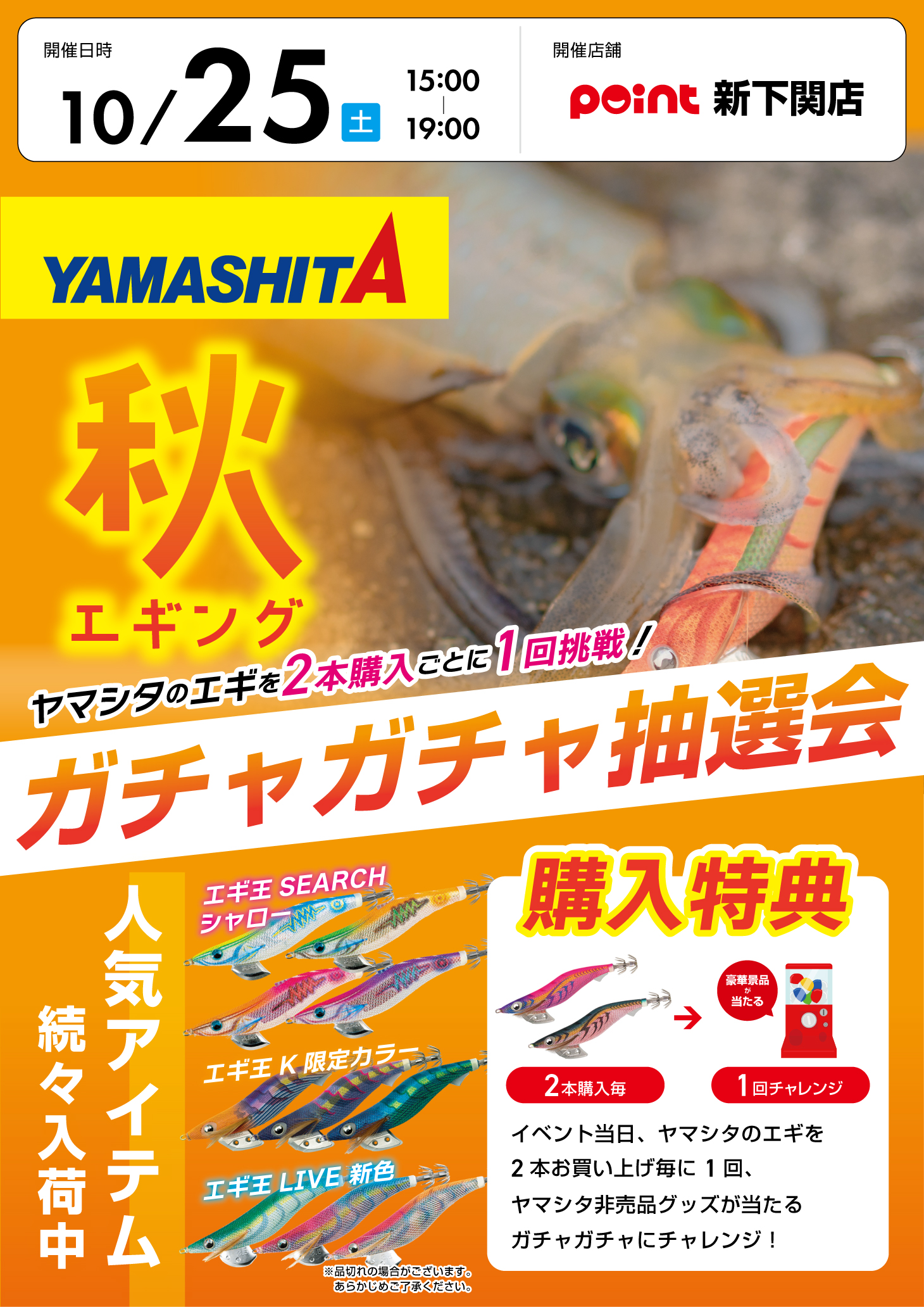 イベント当日、ヤマシタのエギを2本お買い上げ毎に1回、ヤマシタの非売品グッズが当たるガチャガチャにチャレンジ!