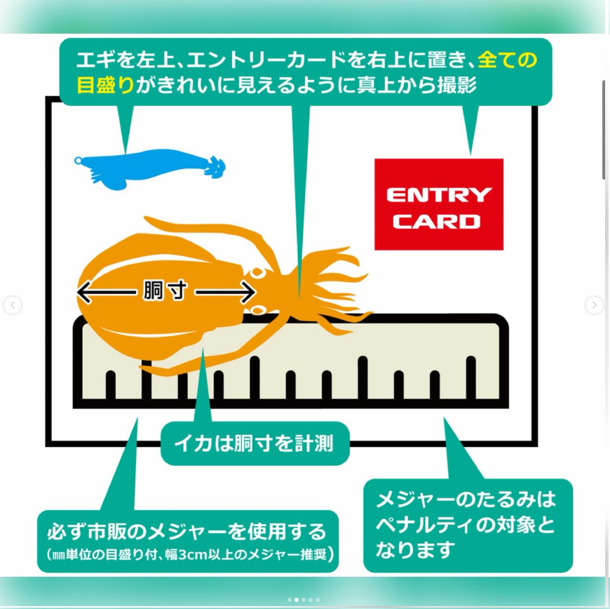 ①エントリーカード、②使用したエギ(セフィアクリンチフラッシュブースト)、③メジャー も一緒に撮影すること