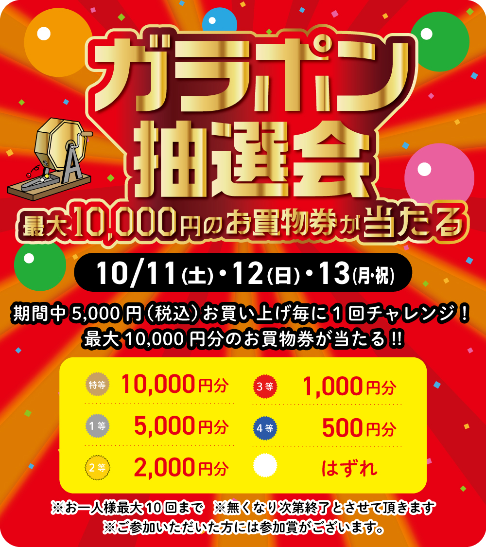 最大10,000円のお買物券が当たる『ガラポン抽選会』を開催!