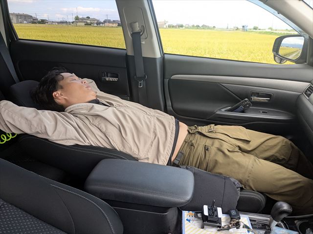 柳川クリークでバス釣り中、「30分寝かせてくれ」とわが愛車のエアコンを付けて気持ち良さそーに昼寝する某関門エリアてんちょ。