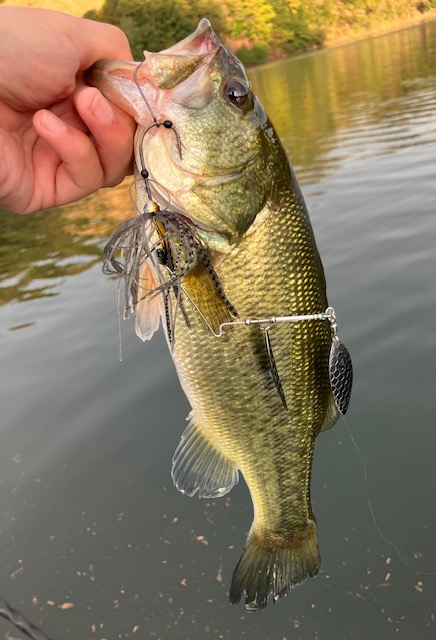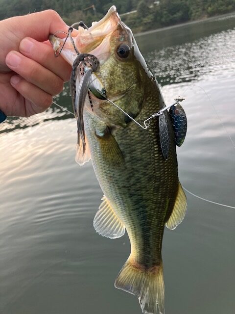 朝一はDαスピナーベイト3/4オンスで3mくらいを狙い開始5分でヒット!